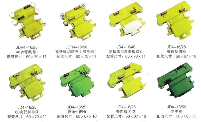 大三極、雙電刷、普通轉彎、轉彎、大頭雙電刷、高低腳轉彎、高低腳、多極多極集電器普通型四極、高低腳四極、普通型、普四極ZJG、小雙電刷、五極、四 極、雙蓋雙孔、六極轉彎、小七極管、大七極管、八極轉彎、十極管、十六極、防塵雙電刷、大四極、四線插座多極多極集電器。